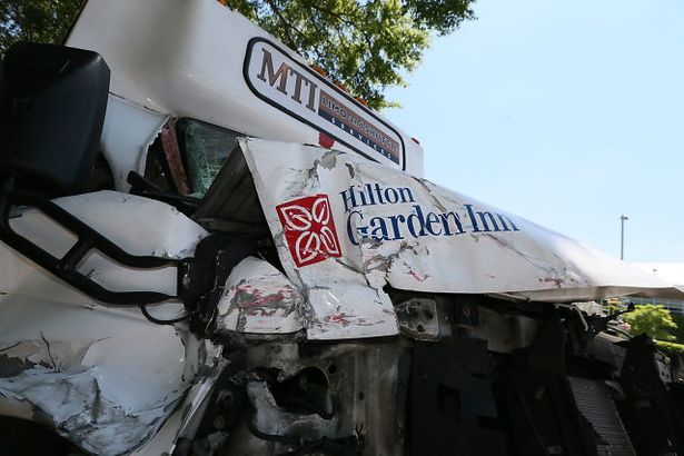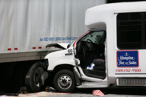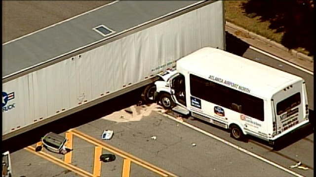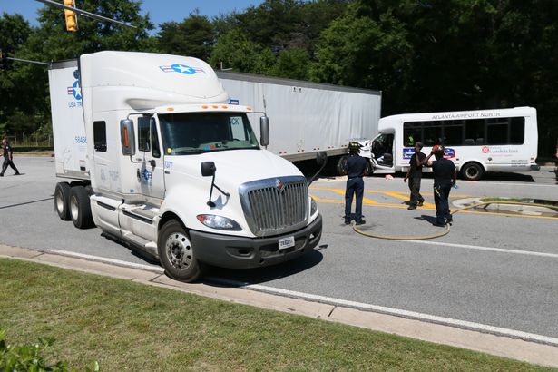 The Georgia State Patrol and College Park Police Department are investigating the crash, but they say it appears the driver of the tractor-trailer was trying to make a u-turn on North Loop Road when the hotel shuttle bus t-boned it.
