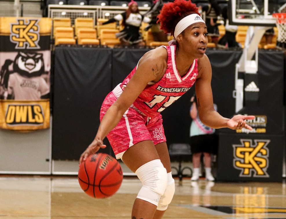 Wearing pink uniforms, Amani Johnson and the Kennesaw State women’s basketball team mounted a huge second-half comeback after being down by as much as 16 points in the first half. Kennesaw State honored returning head coach Agnus Berenato with a 63-57 win Saturday afternoon in the KSU Convocation Center. The team was wearing pink for this particular game to home breast cancer survivors and families and friends, along with those lost to the dreaded disease.