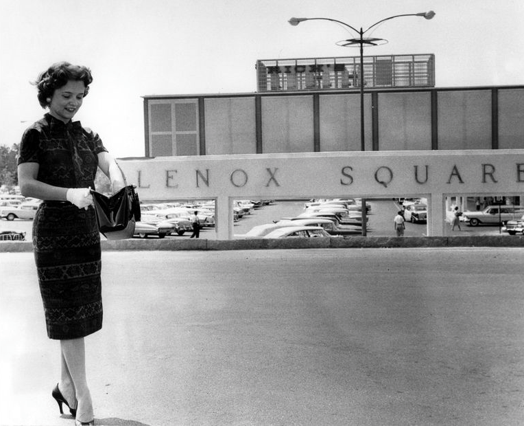 A woman digging in her purse heading into the newly built Lenox Mall. The mall originally opened in 1959 with 60 stores but has now expanded to 250!