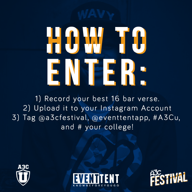 College MCs will have until 11 pm EST on September 23 to record a video of the best 16 bars they have to offer. Contestants will then upload the video to Instagram and tag BOTH @a3cfestival and @eventtentapp while also using the hashtag #A3Cu and the corresponding hashtag for their college.
