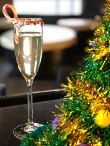 Directions: Rim champagne flute with melted chocolate. Finish rim with crushed candy cane. Garnish with mini candy cane.