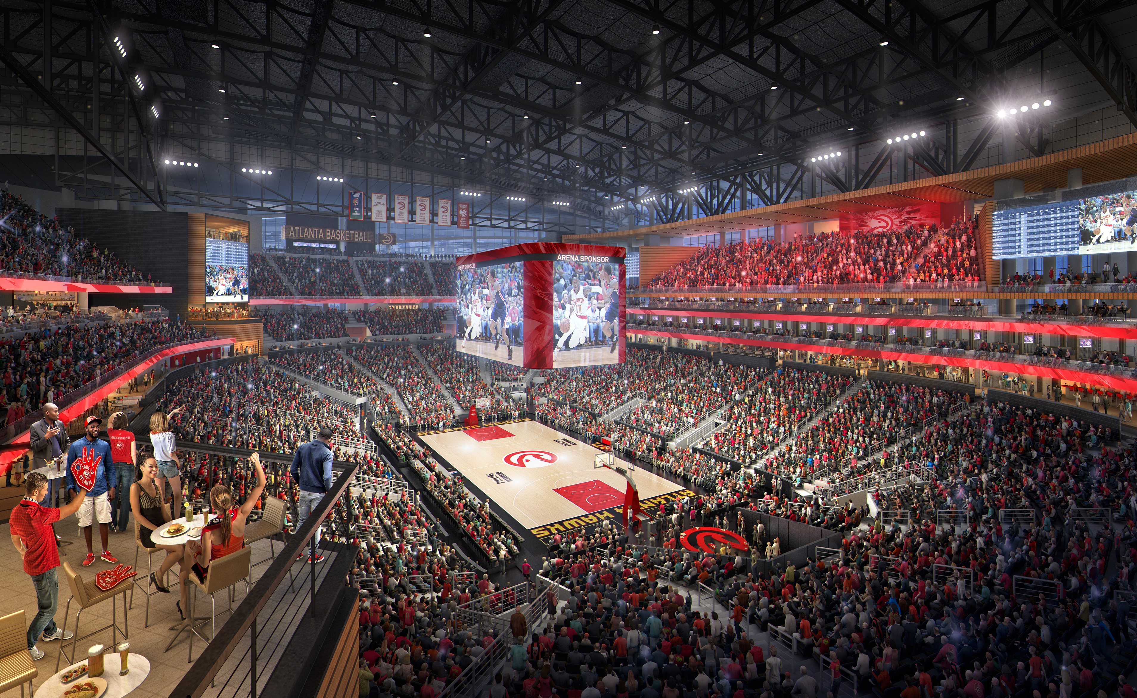 The technology throughout the building will also receive a major reboot, centered around the most modern video capability in sports. The new center-hung scoreboard will be over three times the size of the current model and each corner of the reimagined arena will be anchored by state-of-the-art video pavilions. The arena will be the first with 6mm resolution throughout, allowing fans in any seat the best second screen experience in professional sports. Another new addition to the arena will be the Hawks Meeting and Conference Center, an innovative meeting space including a 250-seat master conference room and four additional breakout rooms equipped with the most advanced technology (touch screen technology, interactive whiteboards and top-notch wireless presentation solutions) and access to full top-shelf bars and amenities.