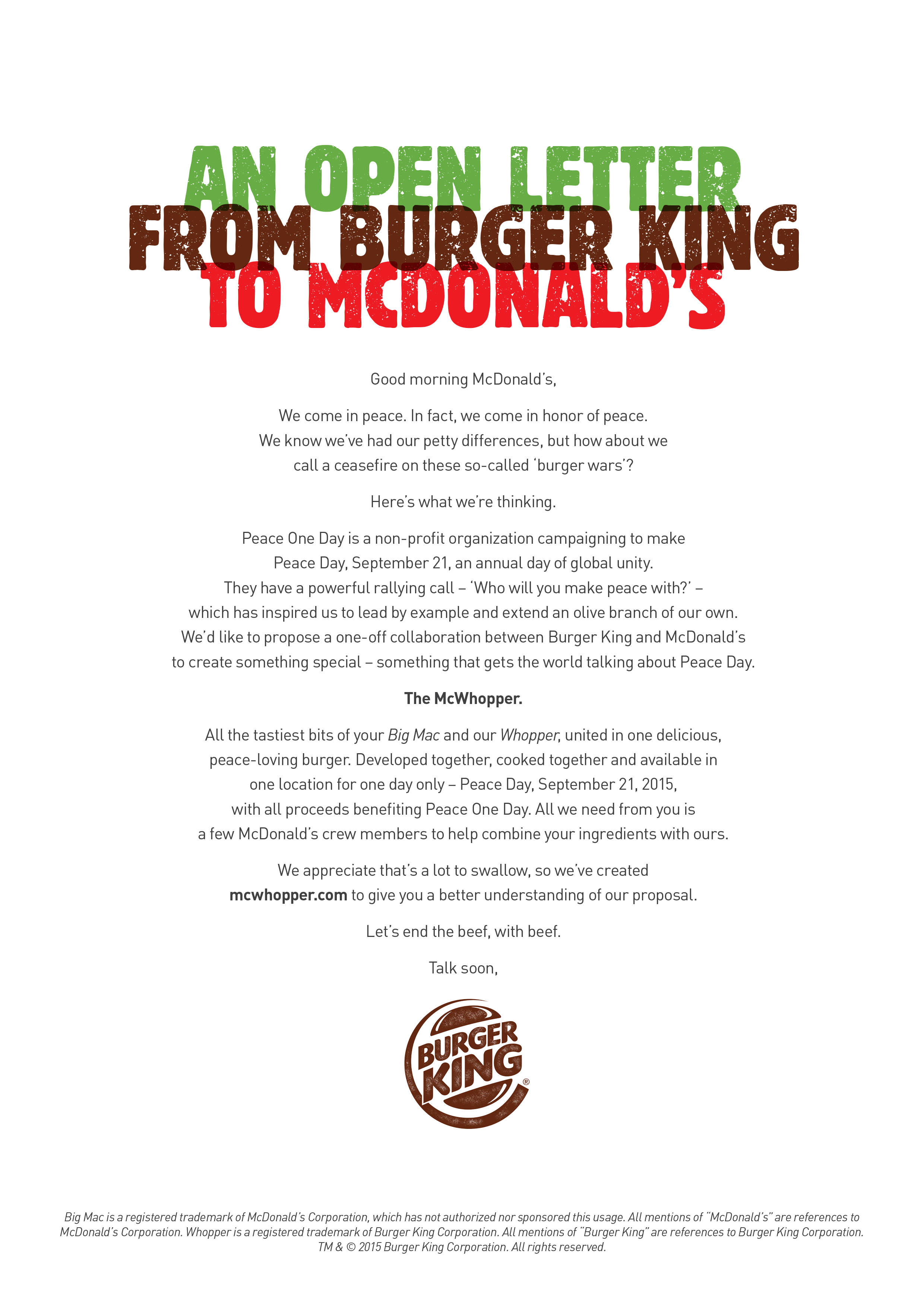 Burger King wanted the one day union to benefit the anti-conflict nonprofit Peace One Day. That nonprofit ties this pretty cool publicity stunt directly back into the United Nations created International Day of Peace.
