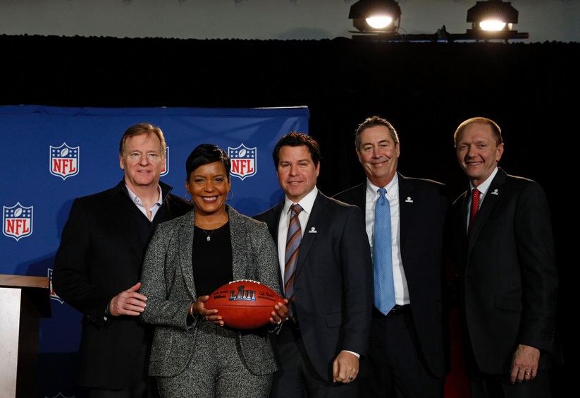 Commissioner Goodell delivered a ceremonial NFL football to the Atlanta Host Committee while unveiling the official Super Bowl LIII logo.