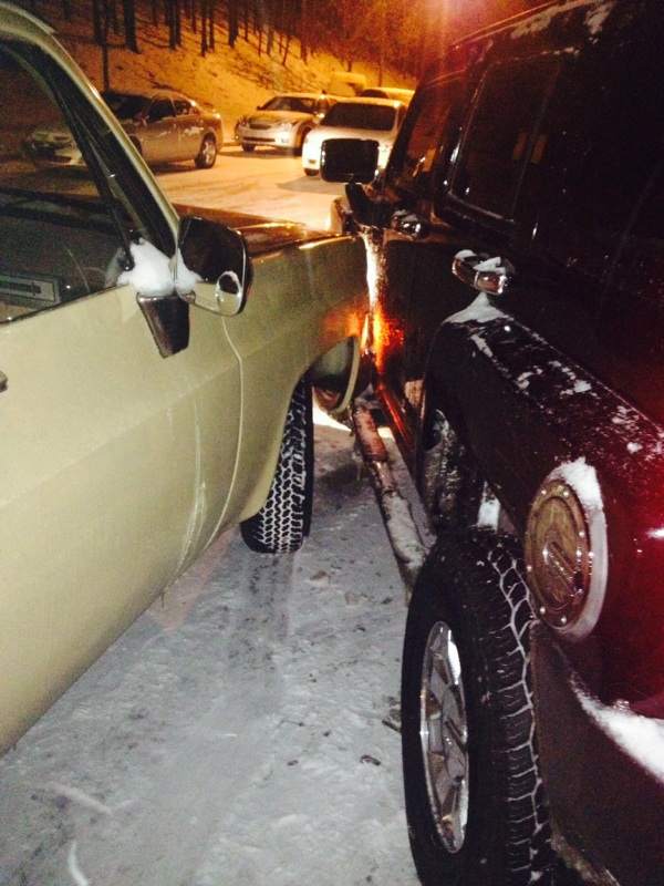 7:23pm – We approach a road that we can take back to our apartment, that seems traffic jam proof. We make a right onto that road out of traffic and then we make an immediate left. When we make this left, there’s a steep hill going down with empty cars decorated on both sides of the road. This should’ve been a sign but we’re in a Hummer and we’re pretty much indestructible, right? Wrong. As we make our way down the hill the truck slides & slams into another truck which seemed to make the same mistake as us because it too was crashed into another truck.