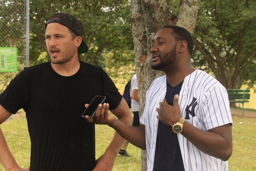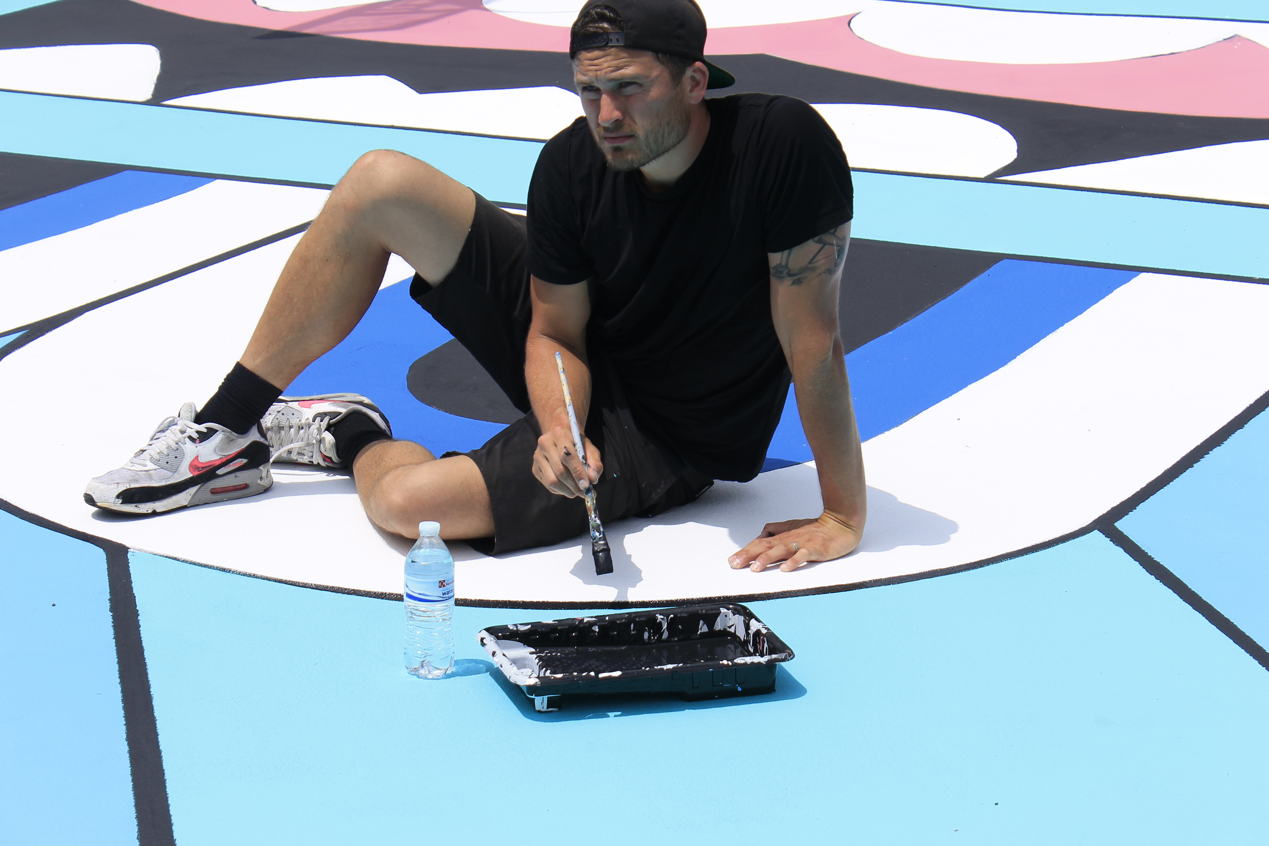 Luckily we had the opportunity to connect with him an overcast day while he was painting his newest installment, “Phoenix II: Courtside Collection” with Mountain Dew’s Green Label. When we arrived he was directing his teammates to finish covering the asphalt to this unique basketball court. RoNNdell Smith talked to him for a minute, here’s what he had to say….