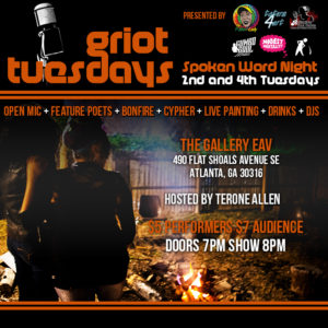 This open mic is hosted every 2nd and 4th Tuesday at The Gallery EAV, 490 Flat Shoals Avenue SE, Atlanta, GA 30316. Griot Tuesdays is created and hosted by Terone Allen of TatersrArt, LLC. The components of this open mic are quite unique compared to other open mics in the Atlanta area. This open mic consists of featured poets, live painting, bon fire, two DJs, and a cypher! The cover charge is $5 for performers and $7 for the general audience. If you are looking to have a great time, or need an outlet to freely express yourself creatively, then Griot Tuesdays are for you! You are in for a refreshing open mic experience indeed! Doors open at 7PM and the show starts at 8PM!