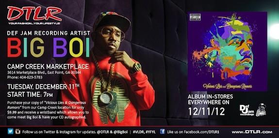 Big Boi will be having a album release album signing for his latest project, “Vicious Lies and Dangerous Rumors” at the DTLR location in Camp Creek, December 11th.’