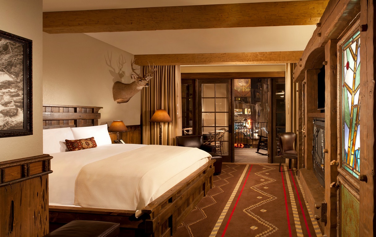 Rooms are designed with the outdoors in mind with guest suites that resemble vintage log cabins. No detail is missed as guests also enjoy access to a fitness center and spa.