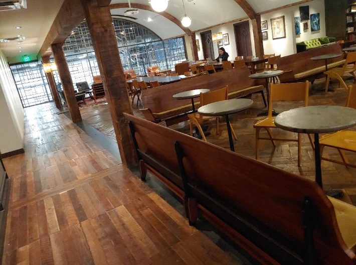 Bold Monk’s third level is the dramatic 5,000-square-foot barrel-vaulted Abbey. This third-space features plush couches and low tables reminiscent of European parlors, as well as a book store with books on philosophy, poetry, history, and literature selected by the Bold Monk community. The intricate Mondrian-influenced glasswork framing the Abbey provides a bird’s eye view of the brewery and brewing process taking place below.