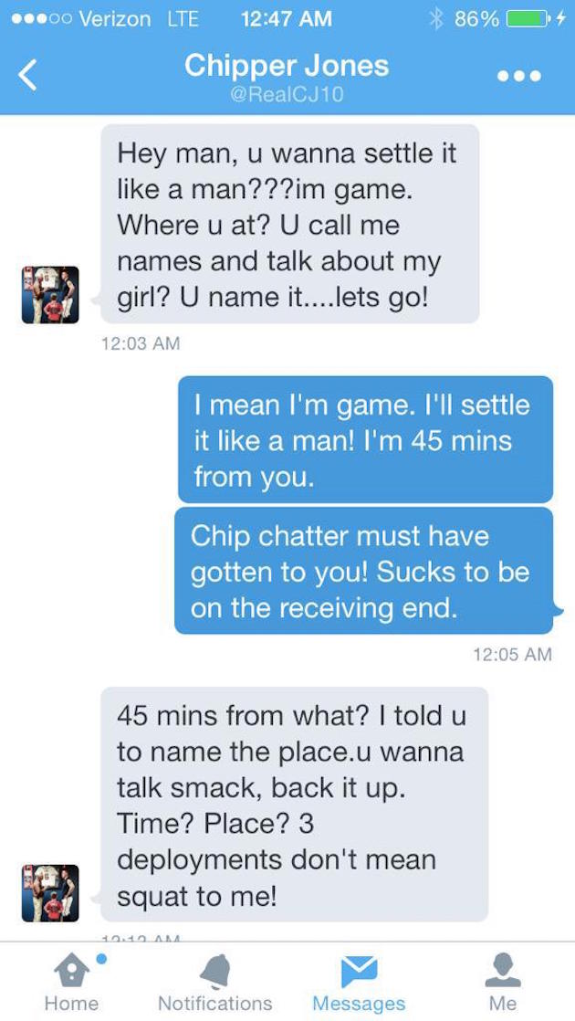 But his public Twitter argument was not enough! Here are the Direct Messages shared between Jones and @thatgrayboy where Chipper tried to INITIATE an actual fight.