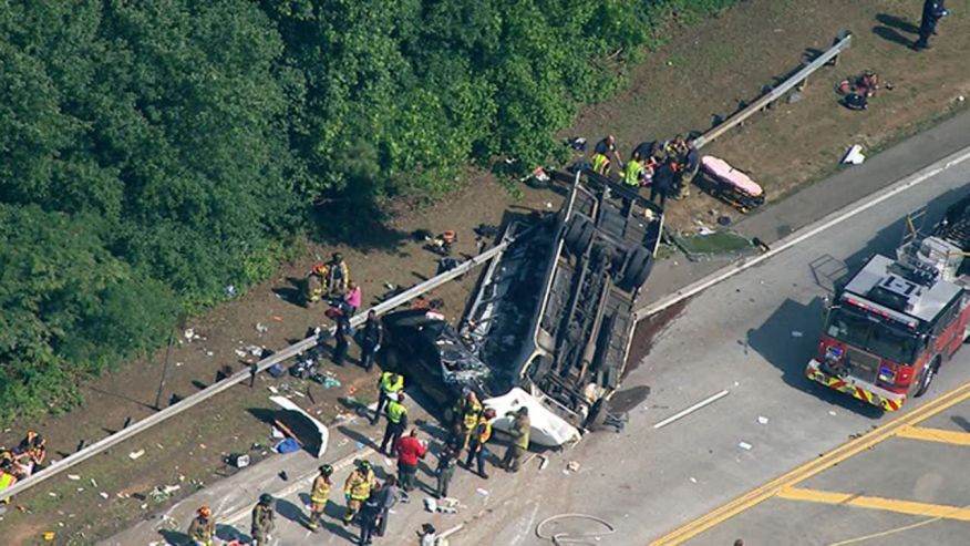 Images from television news helicopters showed the charter bus completely overturned, with portions of it crushed and resting next to a dark-colored sedan.