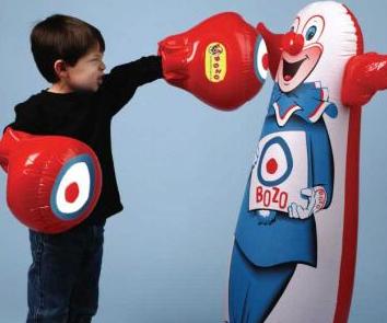 A bat is swung immediately at the clown. The bat struck the clown straight at the knees which causes it to stumble backwards. The two men throw several punches before leaving with a few balloons and an interesting night.