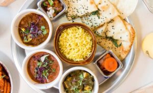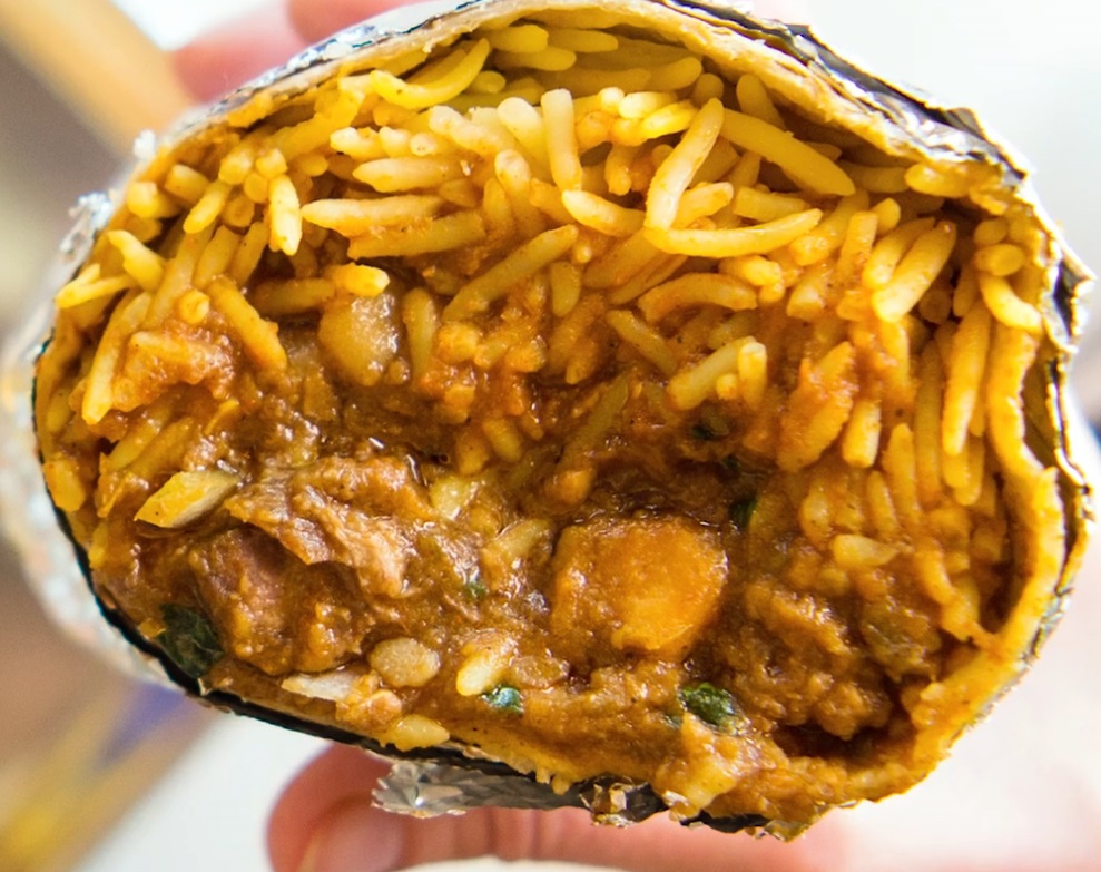 Menu items include the iconic Tikka Masala Burrito, Deconstructed Samosa, Kathi Rolls, and Thali Platters.