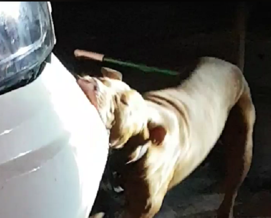 It was trying to get to two cats that were hiding underneath her car, but police said the dog was not aggressive toward people, only property. The video shows the animal ripping the bumper apart.