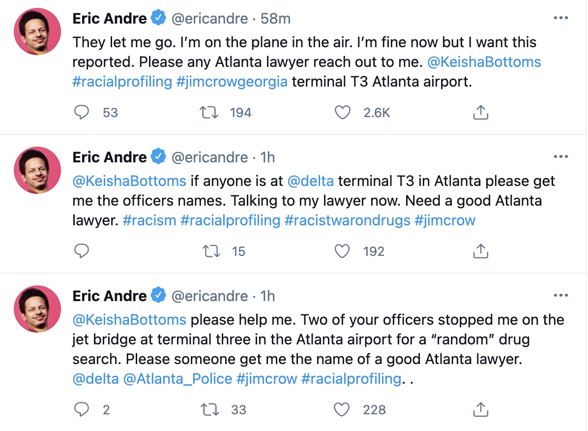 Comedian Eric Andre says he was treated unfairly at Atlanta airport recently. Andre took to Twitter on Wednesday to call out Mayor Keisha Lance Bottoms and Delta for the events that took place.