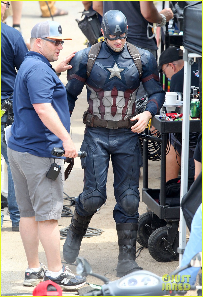 There have been multiple sightings of stars: Chris Evans (Captain America), Anthony Mackie (Falcon), Scarlett Johansson (Black Widow) and Frank Grillo (the super villain “Crossbones”) in full costume! All photos courtesy of Just Jared!