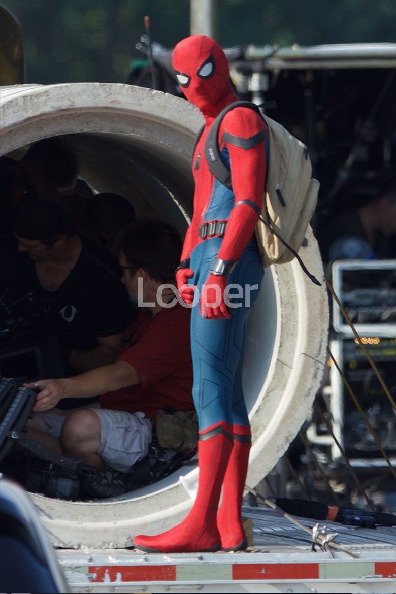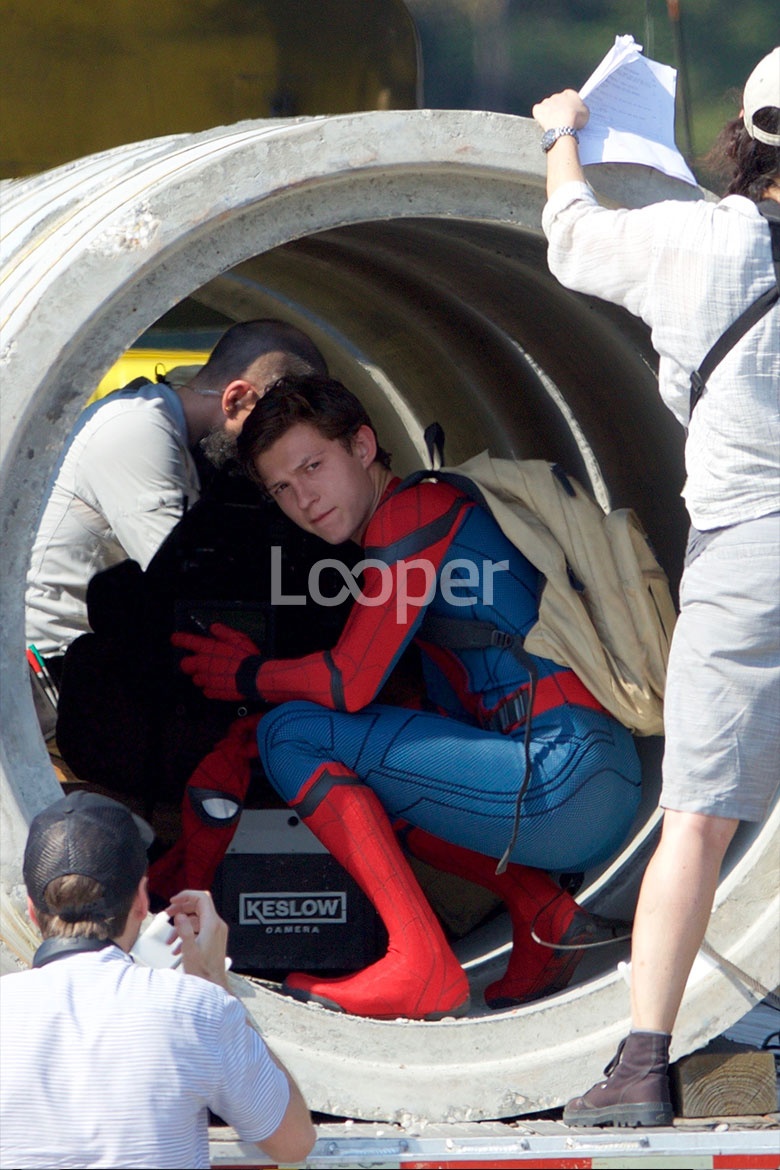 The pictures seem to show Peter Parker, who is on a school trip at the time, having to suit up due to some disturbance. A villain stopping traffic? Or possibly something throwing the cement pipes he’s pictured in/on? CGI will be used, as expected, to finish the super human part of the scene, but reports say that Tom has been doing most of his stunt work so far. Not to mention that he is doing all this in the 100 degree and very humid weather Georgia is currently experiencing? Round of applause!