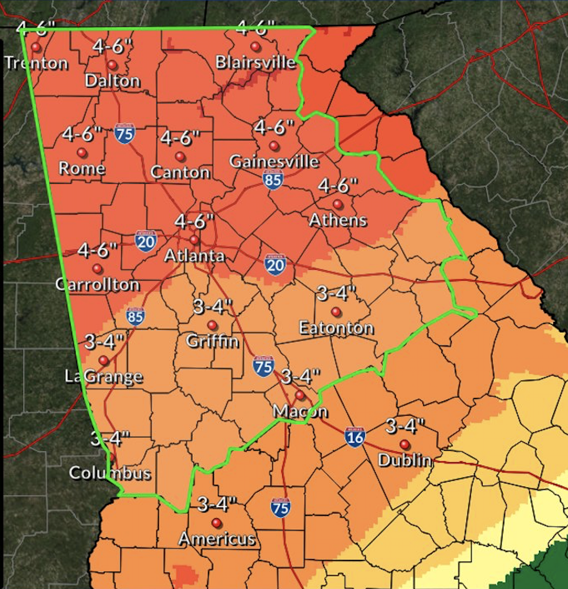 The National Weather Service has issued a flash flood watch from 7 PM Thursday to 7 AM Saturday morning for all of North Georgia stretching down past Macon. Meteorologists are predicting 2 to 4” rain for North Georgia and 1 to 2” of rain for Central Georgia.