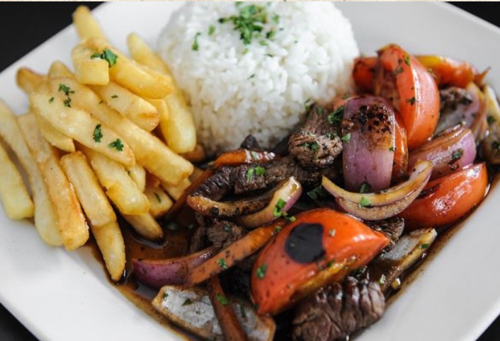 Lomo Saltado – Stir fried Teres Major, red onion, roma tomatoes, and aji amarillo served with white rice and fries
