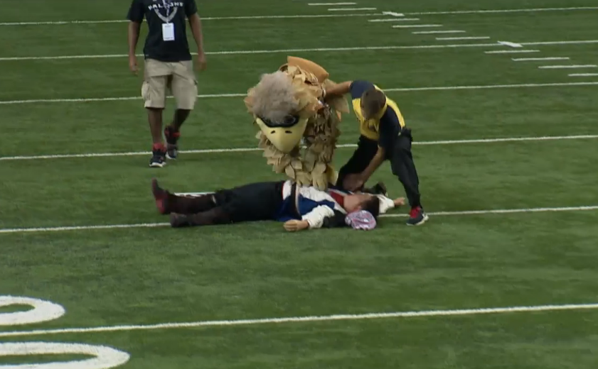 During the 56-14 rout of the Buccaneers last night, a fan dressed like a Buccaneer ran onto the field. While the CSC Event Staff was chasing the fan around the field, Freddie Falcon decided to take matters into his own hands by channelling his inner Keith Brooking.