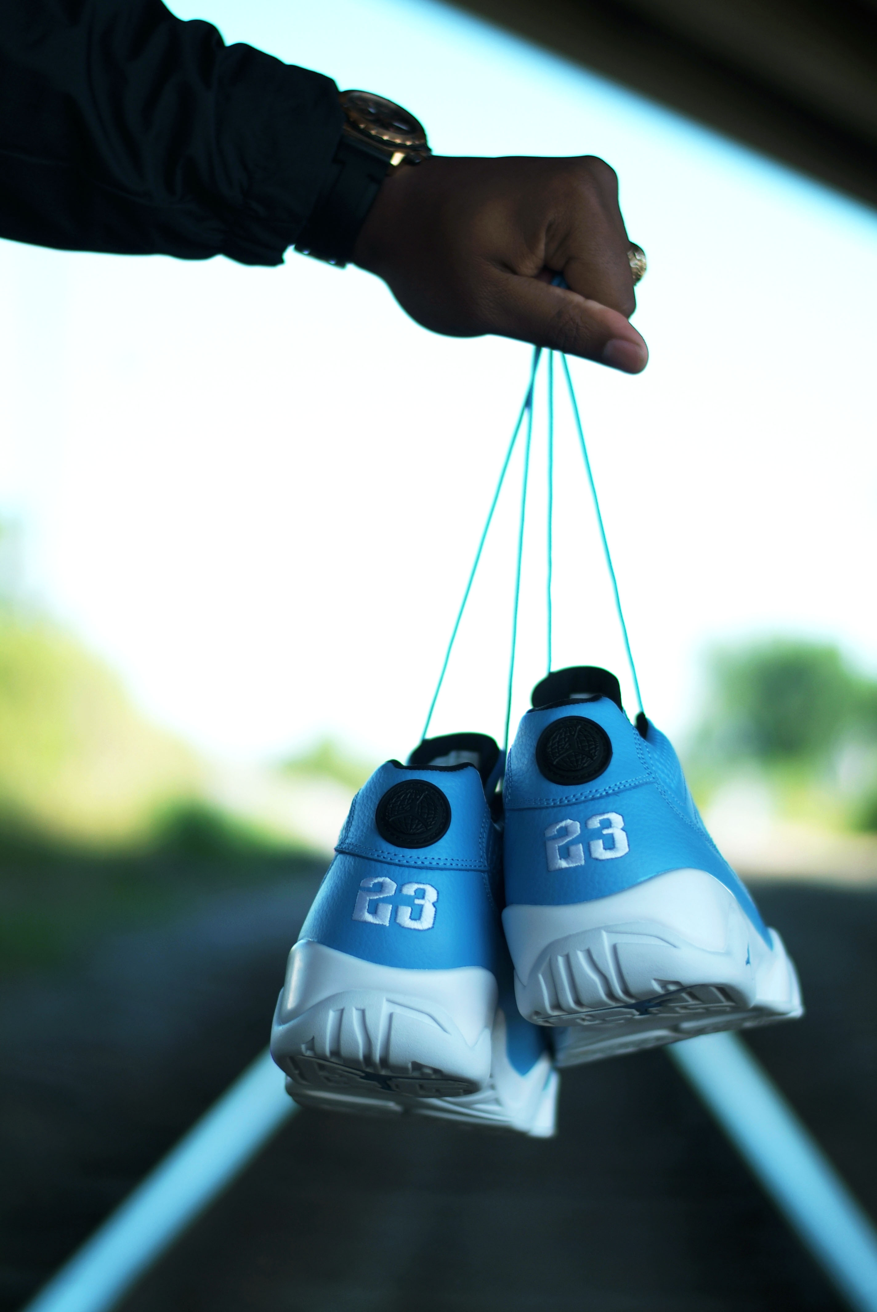The Air Jordan 9 Low Pantone features a full leather University Blue upper with a textured leather on the mudguard and heel. The midsole and outsole are all white which makes for a striking summertime contrast. The heel features a black Jumpman logo with a white 23 stitch underneath.