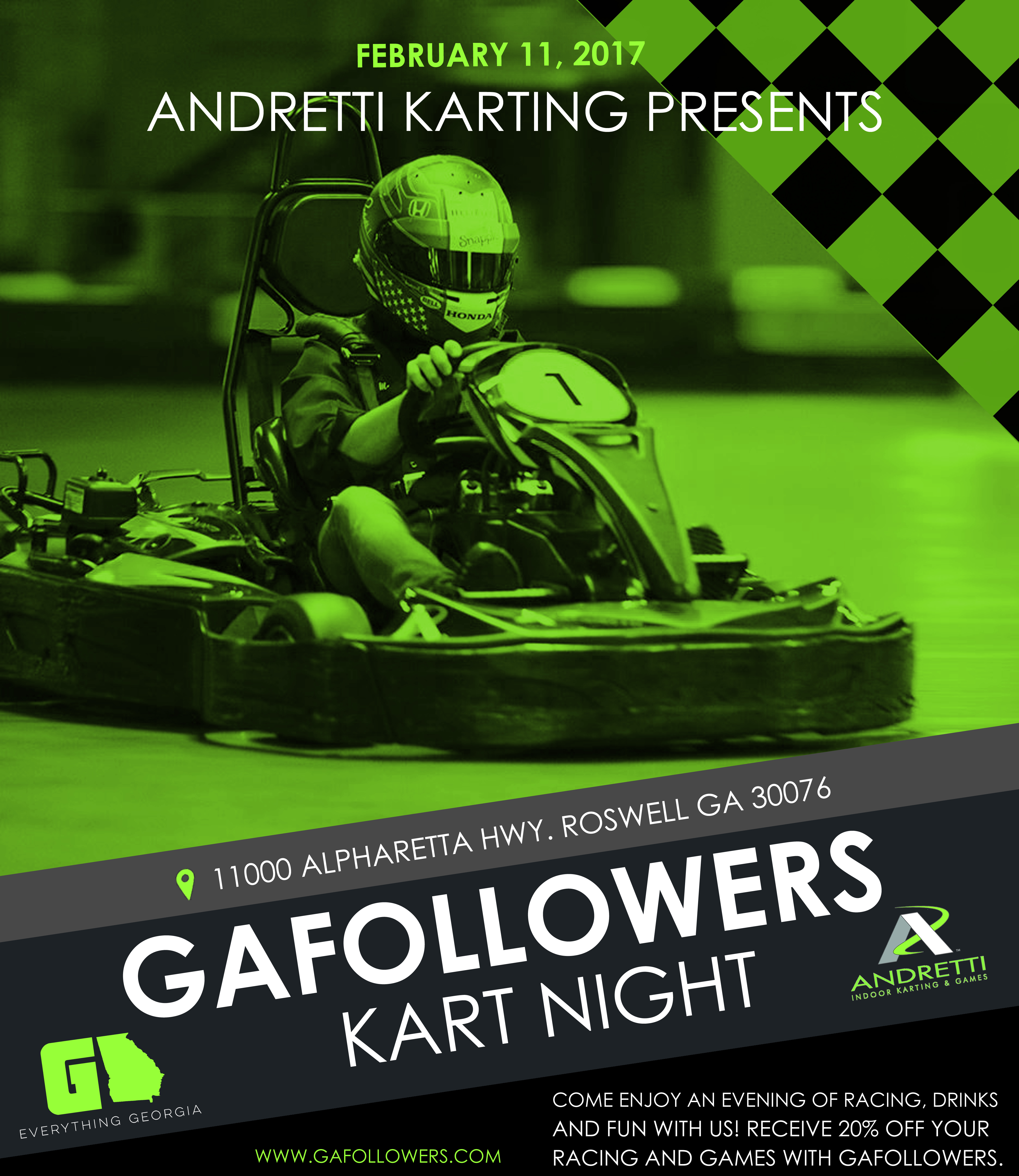 We’ve teamed up with the Andretti Indoor Karting and Games in Roswell to offer a night of racing, games and fun for our followers! With everything that has happened over the past week, this is just a night to relax and network with one another. They’ve also given our followers 20% off for the entire evening (alcohol and gift card purchases not included)!