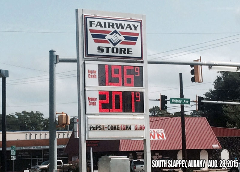 If you live in South Georgia, here’s some great news! Gas has now dipped under $2 in Albany, Georgia. The Fairway Store on South Slappey Boulevard has a gallon of regular gas for $1.96.