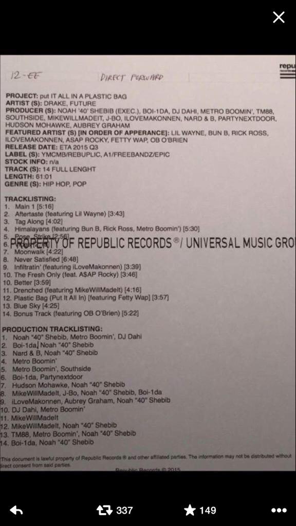 If this picture, which you can view below, is factual, then fans of the “Where Ya At” rappers can expect new verses from Lil Wayne, Rick Ross, A$AP Rocky, Fetty Wap and more. The name of the mixtape seems to be titled “Put It All In A Plastic Bag” and hosts 14 songs produced by Noah “40” Shebib, Mike WiLL Made It, Metro Boomin, and more.