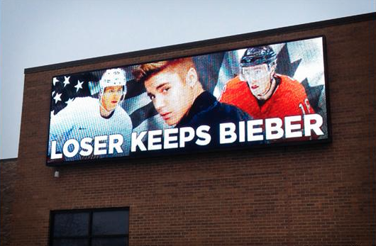 Justin Bieber is always in the news for something comical. This time there’s a billboard in Chicago that is gearing for the U.S./Canada hockey game for the Winter Olympics in Russia tomorrow.