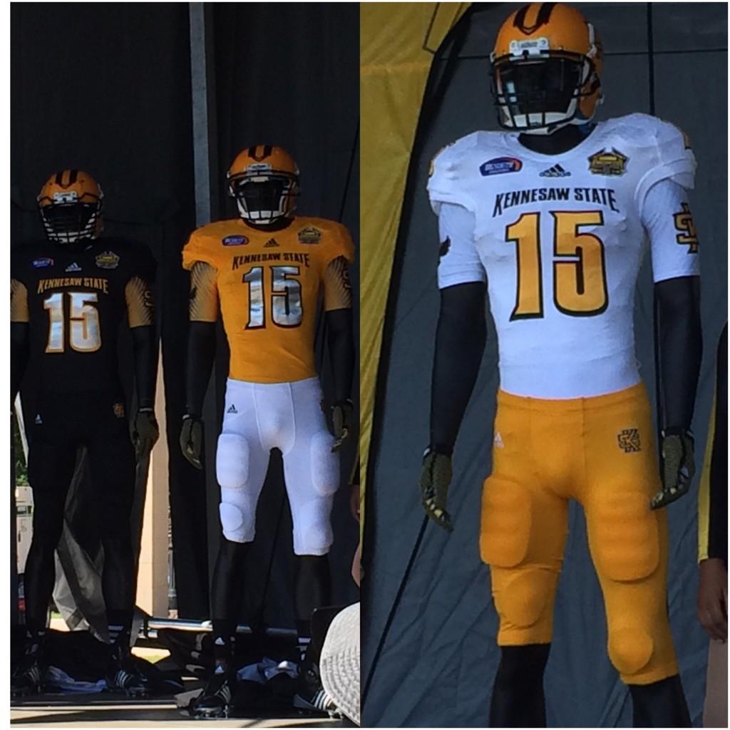 This past weekend Kennesaw State officially revealed their new football uniforms for their inaugural season in 2015. The first scrimmage for KSU will be during spring of 2015. The jersey’s are sponsored by Adidas and there are 3 different types including the home/away black & white and the alternative yellow.