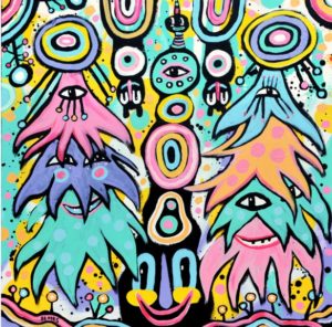 Brooks has become known for his street poems, whimsical roadside art installations, and bold colorful murals. With his brush, bright colors, and found materials, he intends to paint the world “Happy.” In addition to turning the streets of Atlanta into his personal canvas, Brooks has partnered with companies like Coca-Cola, Delta Airlines, Weather Channel, and Adult Swim, among many others. With his debut show, A Bowl Full of Happiness, Brooks will fill the walls of Spalding Nix Fine Art with his whimsical characters and bountiful landscapes.