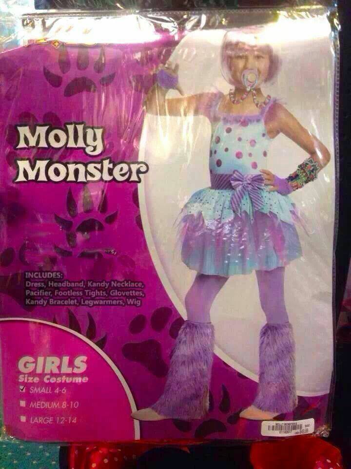 I’ve seen some pretty crazy costumes for Halloween. Being a college kid, you see several of the college boys sporting the either racially risky or downright dirty costumes throughout the night of debauchery. But never have I seen something like “Molly Monster.” Let alone, for girls under the AGE OF TWELVE.