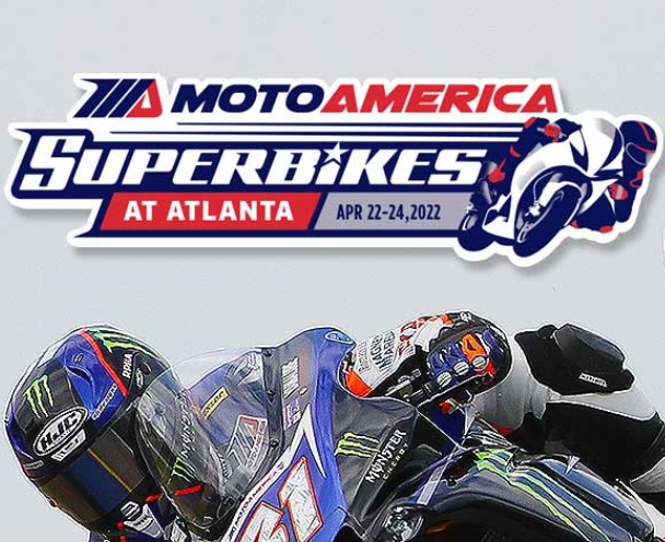190 mph superbikes and some family fun? MotoAmerica Superbikes at Atlanta is coming April 22-24, 2022. Enjoy practice and qualifying on Friday plus all-day racing Sat & Sun! 6 classes of road racing – Superbikes, Supersport, Stock 100, Twin Cup, Junior Cup and King of the Baggers. Meet the riders in our open race paddock! VIP, Camping and Grid/Pit access packages available. Kids 12 and under free with paying adult. Bring the family for our Kids Zone and free carnival games.
