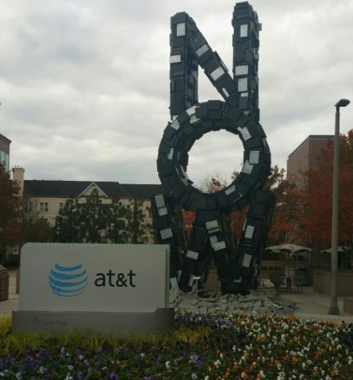 On Monday, AT&T celebrated some news and also a new art installation on their Atlanta AT&T campus. Created out of materials pulled from our recycling program, this tower is made of steel bars and old set-top boxes to spell out the word “NOW.” It stands 30-feet tall and weighs 25,000 lbs.