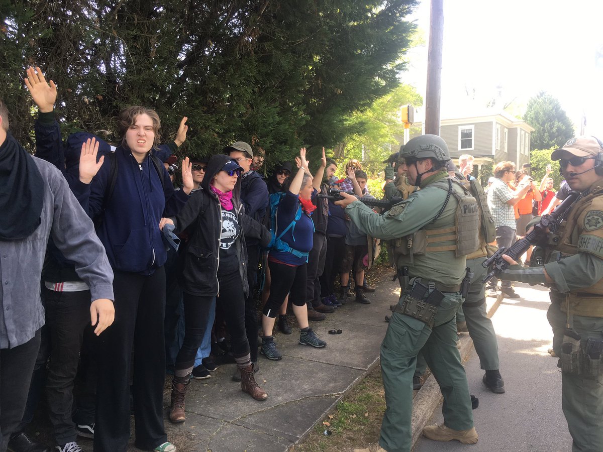 Members of Antifa, the loose-knit anti-fascist movement, gathered along the sidewalks on streets leading to Greenville Street Park, the site of the neo-Nazi park.