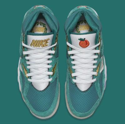 Draped in emerald hues with overlaying panels of perforated and suede leather, gold accents along the lace hooks and sides evoke the achievements of the athletes that competed in the event. An embroidered peach on the tongue champions the host city while a Nike logo juxtaposed with laurel wreaths on the heel reaches back to the Olympics’ origins.