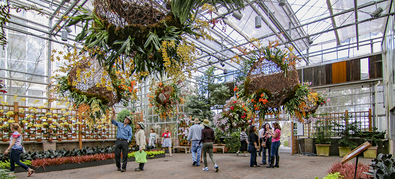 In the Fuqua Conservatory lobby, guests stroll under a canopy of stately Caribbean palms while tropical orchids in mango, pineapple and coral colors burst like sparklers overhead. Below is a diverse carpet of exquisite slipper orchids of varying sizes.