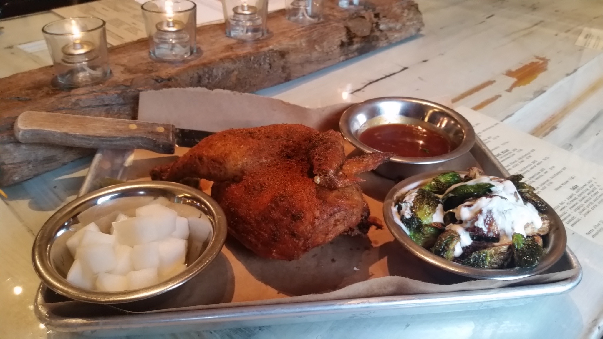 Let’s not get started on the brussels sprouts side dish. It is made very simply with a sprinkle of salt and pepper, then tossed in a dash of honey. Simple ingredients that resulted in a very delicious side dish that go hand-in-hand with the dry-rubbed, roasted chicken. Other tasty sides are offered as well, such as ginger-apple collard greens, house kimchi, pickled cucumbers, cilantro-lime rice, and poppy seed cole slaw.