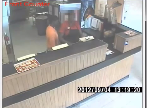 Surveillance video from the store on Campbellton Road shows the suspect jump over the counter and attempt to get money from the cashier. The female employee then noticed that the robber didn’t have a weapon, so she began fighting back, grabbing his neck and choking him. Another employee, apparently wielding a broom, joined in to ward off the robber.