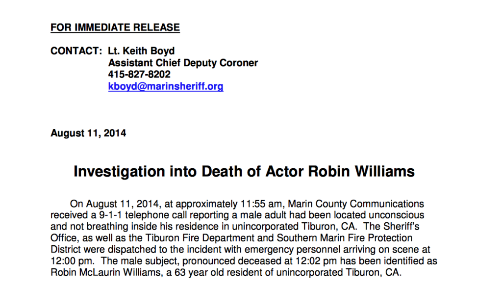 Actor Robin Williams has died, the Marin County Sheriff’s Office says. It is investigating his death, believed to have been a suicide.