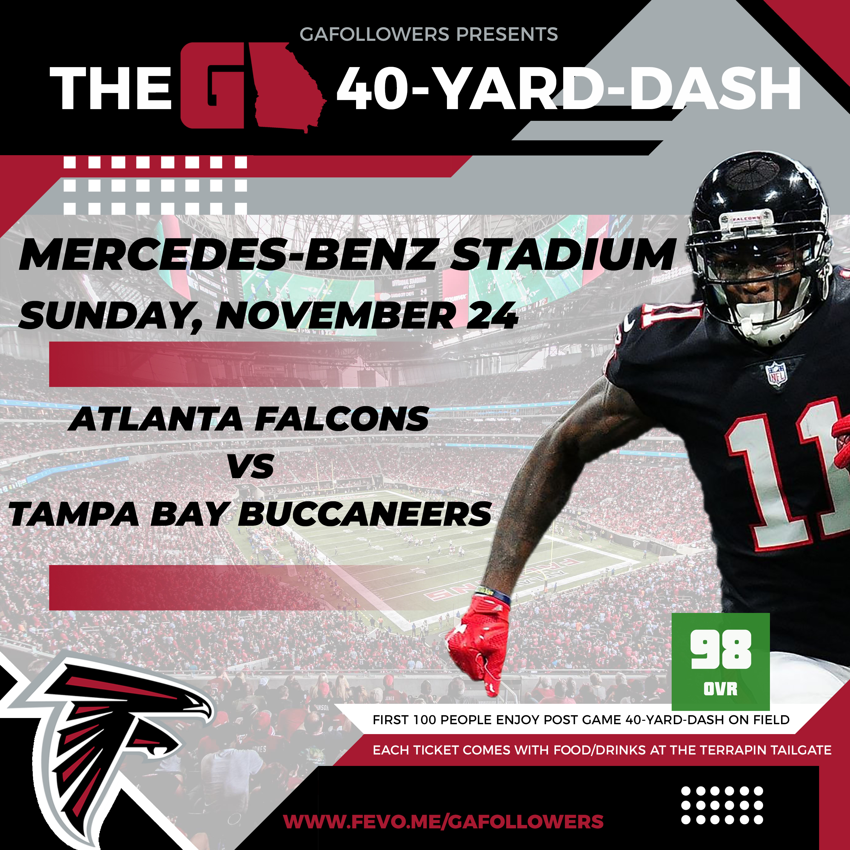 Sunday, November 24, the Atlanta Falcons will face the division rival Tampa Bay Buccaneers at Mercedes-Benz Stadium. As a thank you, to not only our fans but LOYAL Falcons fans across the state, we’ve partnered with the team to offer affordable tickets to the game! Tickets include food from Jim ’N Nick’s and up to 3 drinks at the Terrapin Tailgate, in the Home Depot Backyard, before the game.