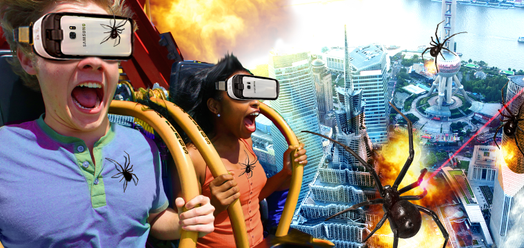The Acrophobia has been transformed into the Drop of Doom for a limited time with the help of Samsung VR headsets that place riders in the middle of a fictional city under attack by giant spiders. Fortunately, riders aren’t dropped in the middle of the chaos without assistance. Giant Gundam-like defenders are also present and helping to keep the creatures at bay. In addition to the robot fighters on their side, Drop of Doom riders also have their own gun they can use (by tapping the side of the headset) to rack up some points for shooting as many of the spiders as they can. All the while, riders are still being lifted in the air and will soon plummet 100 stories before seeing exactly how this creepy crawly story concludes.