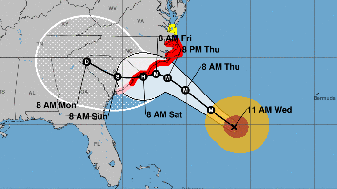 A hurricane warning – meaning hurricane conditions are expected within 36 hours — is in effect for a long stretch of the coast, from the Santee River in South Carolina to Duck, N.C., which is part of the Outer Banks.