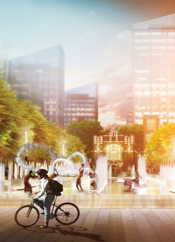 That new landscape could include public greenspace to host concerts and events—parks bracketed by newly reconnected streets that now dead-end. It would also—perhaps by financial necessity—include a cluster of new hotels, residential buildings, and office towers, according to a study that forms the conceptual blueprint for the Stitch.”