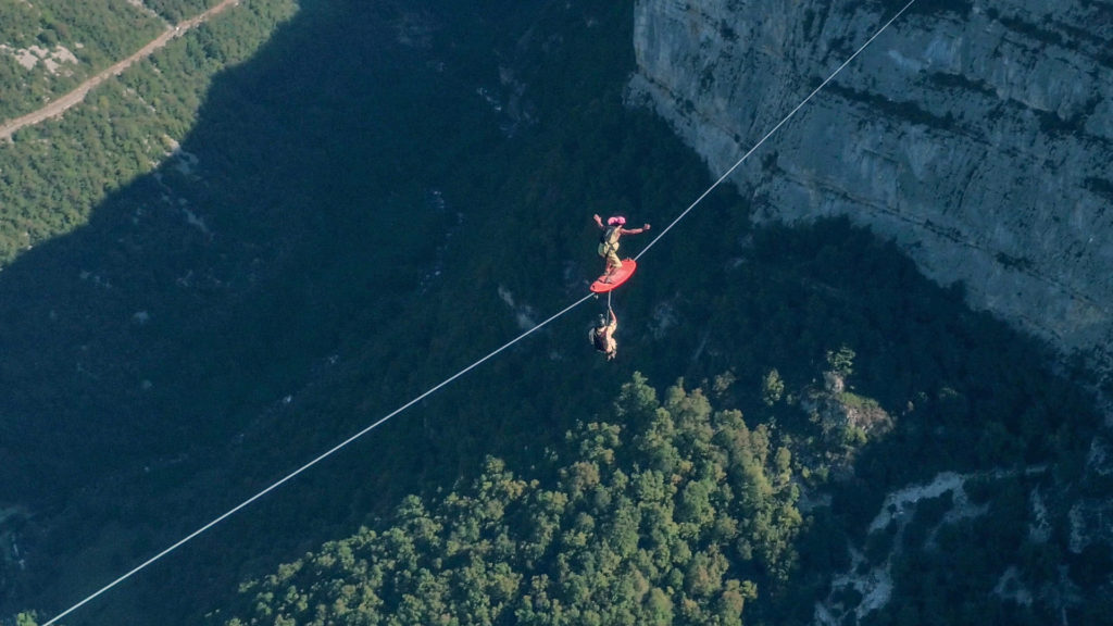 For the Flying Frenchies, play is central to everything they do and the surfers took off from one side of the ravine in the Vercors mountain range to the other with another on the zip wire below.