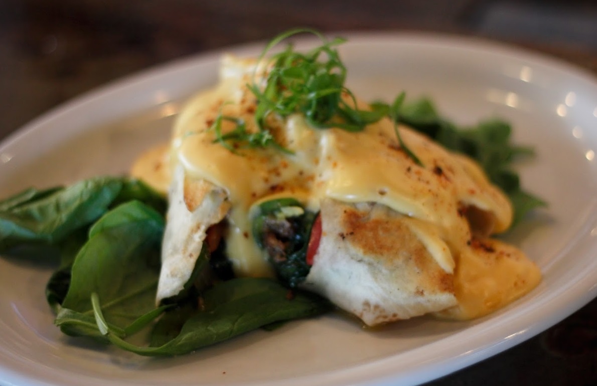 Smoked Chicken Hash: Charred smoked chicken, potato hash, roasted corn, spinach, 2 eggs, cheddar and roasted tomato aioli