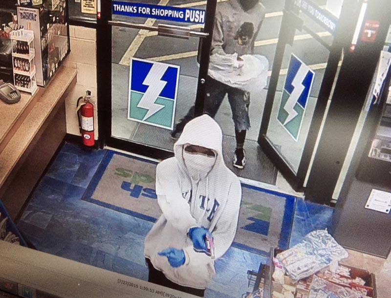 Police say they burst into the store, and told two customers to sit down on the floor, and pointed a pink revolver at them. The gunman then pointed the gun at the clerk, and demanded money from the cash register.