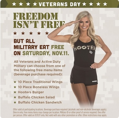 The complimentary Veterans Day entrée, ordered off the free meal menu, is redeemable during business hours on Veterans Day, Nov. 11, at any participating Hooters location across the U.S. with the purchase of a beverage. There is no coupon required to activate the deal, veterans and military personnel just need to present a military ID or proof of service to their Hooters Girl while dining in at their favorite location.