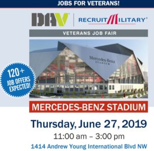 DAV and RecruitMilitary will host the Atlanta Veterans Job Fair on Thursday, June 27th from 11am to 3pm at Mercedes-Benz Stadium. This free event for veterans, military spouses, transitioning military, National Guard members and Reservists features 80+ employers ready to hire.